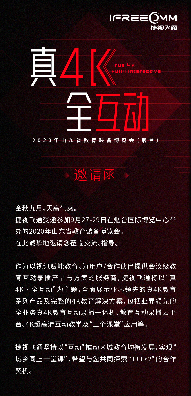 金秋九月,天高氣爽。捷視飛通受邀參加9月27-29日在煙臺(tái)國(guó)際博覽中心舉辦的2020年山東省教育裝備博覽會(huì)。在此誠(chéng)摯地邀請(qǐng)您蒞臨交流、指導(dǎo)。