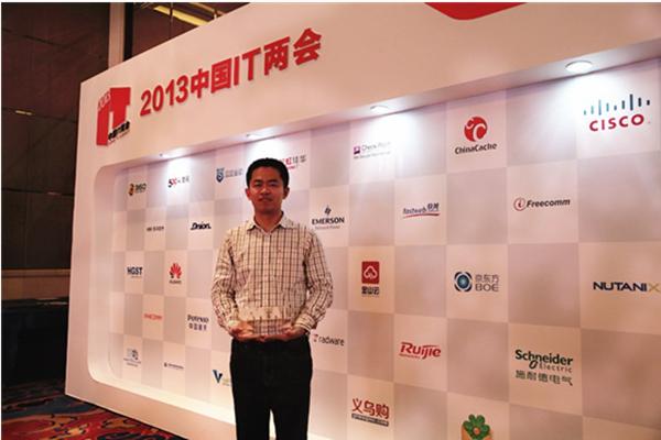 IT財(cái)富墻前孫總監(jiān)展示獲獎(jiǎng)“獎(jiǎng)杯”